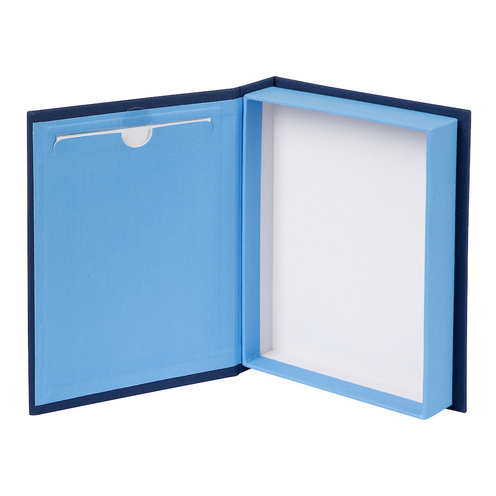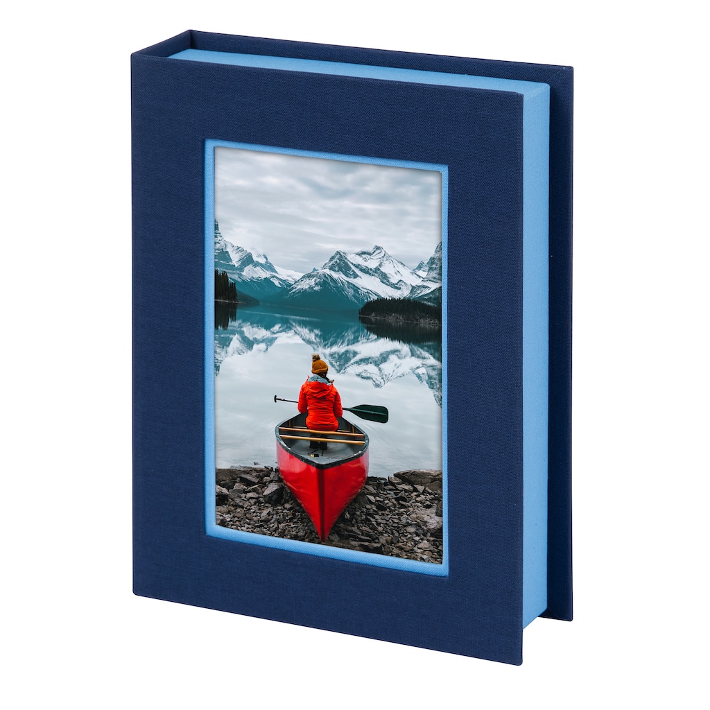 Aan de voorkant kun je een eigen foto plaatsen. Zo maak je de doos in één oogopslag herkenbaar en geef je jouw herinneringen een persoonlijke plek die je met plezier in het zicht laat staan. Het diepe blauw in combinatie met de zachte lichtblauwe details zorgt voor een frisse, rustige look die past in elk interieur.