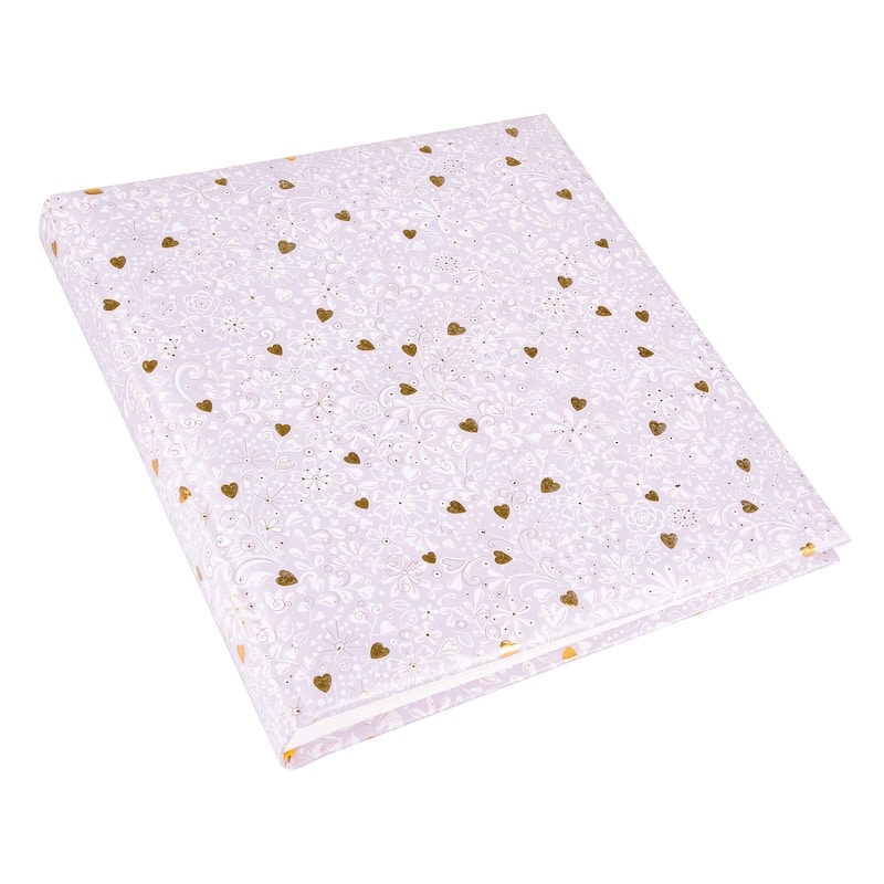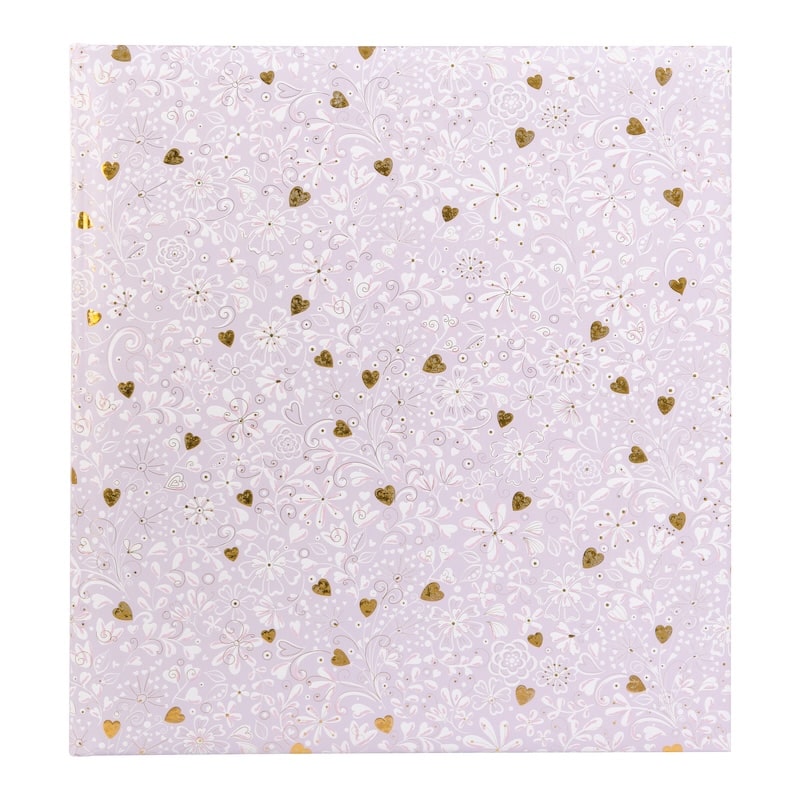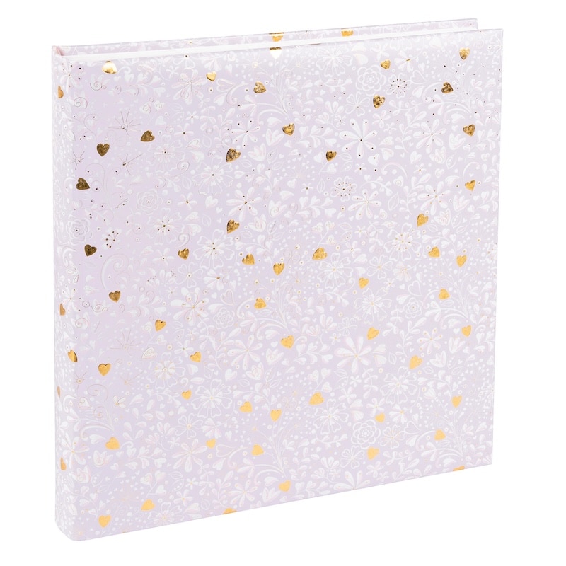 De voorkant is versierd met een romantisch patroon van bloemen en sierlijke lijnen, aangevuld met kleine gouden hartjes die subtiel oplichten. Het ontwerp voelt dromerig en vrolijk, waardoor dit album heel geschikt is voor liefdevolle mijlpalen en speciale gelegenheden.