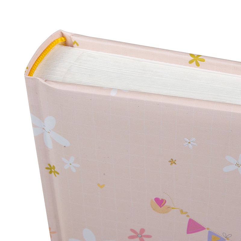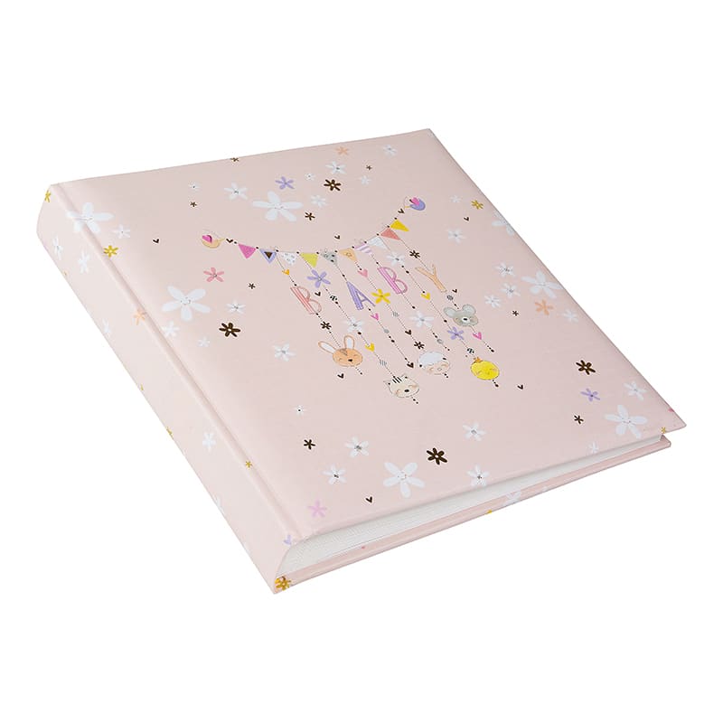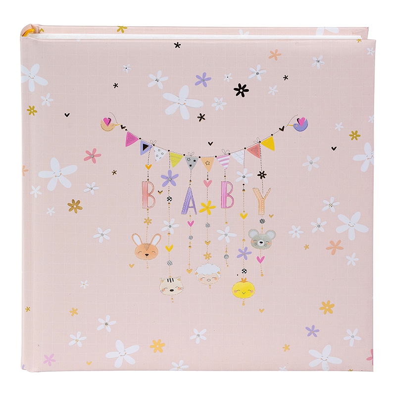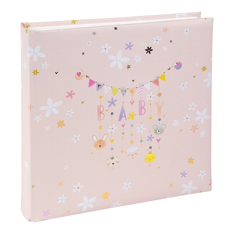 Het Fotoalbum Lullaby Line Girl heeft een zacht en dromerig design van House of Turnowsky. De lichtroze kaft is versierd met fijne bloemetjes en een lieve slinger met de letters BABY. Aan de slinger hangen schattige diertjes en kleine figuurtjes die samen zorgen voor een warme en rustige uitstraling. Het ontwerp voelt lief en speels aan, perfect voor de eerste herinneringen.