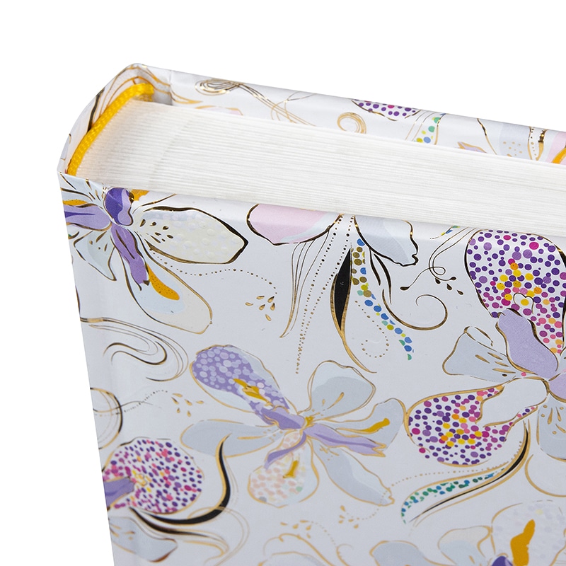Het Fotoalbum Orchid Mood in wit straalt rust en verfijning uit. De lichte achtergrond laat het orchideeënmotief mooi tot zijn recht komen. De bloemen zijn speels verdeeld over de kaft en combineren zachte paarstinten met fijne gouden details. Dit geeft het album een frisse uitstraling met een subtiel luxe gevoel. Het ontwerp is gemaakt door House of Turnowsky en valt op door de elegante lijnen en lichte sfeer.