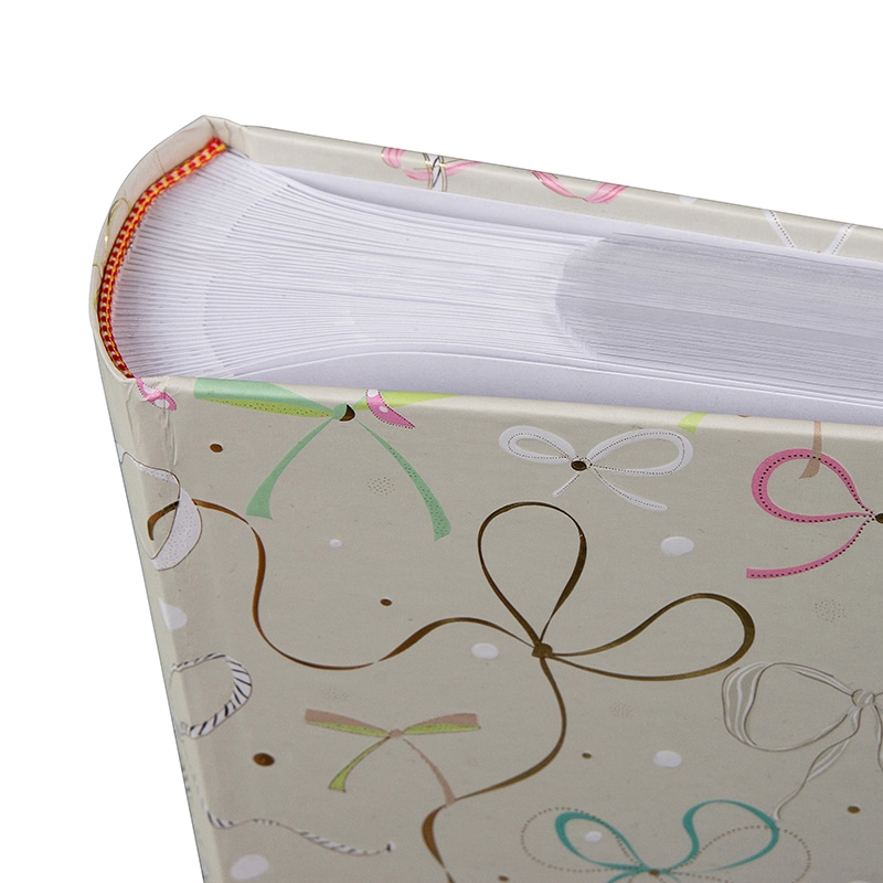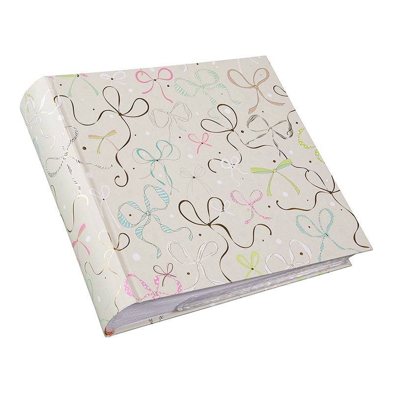 Bewaar je mooiste herinneringen in het Ribbone insteekalbum. De zachte taupe kaft is versierd met speelse strikjes in pastelkleuren zoals mintgroen, roze en wit. Het subtiele patroon en de rustige tinten geven het album een charmante en stijlvolle uitstraling die bij elk interieur past.
