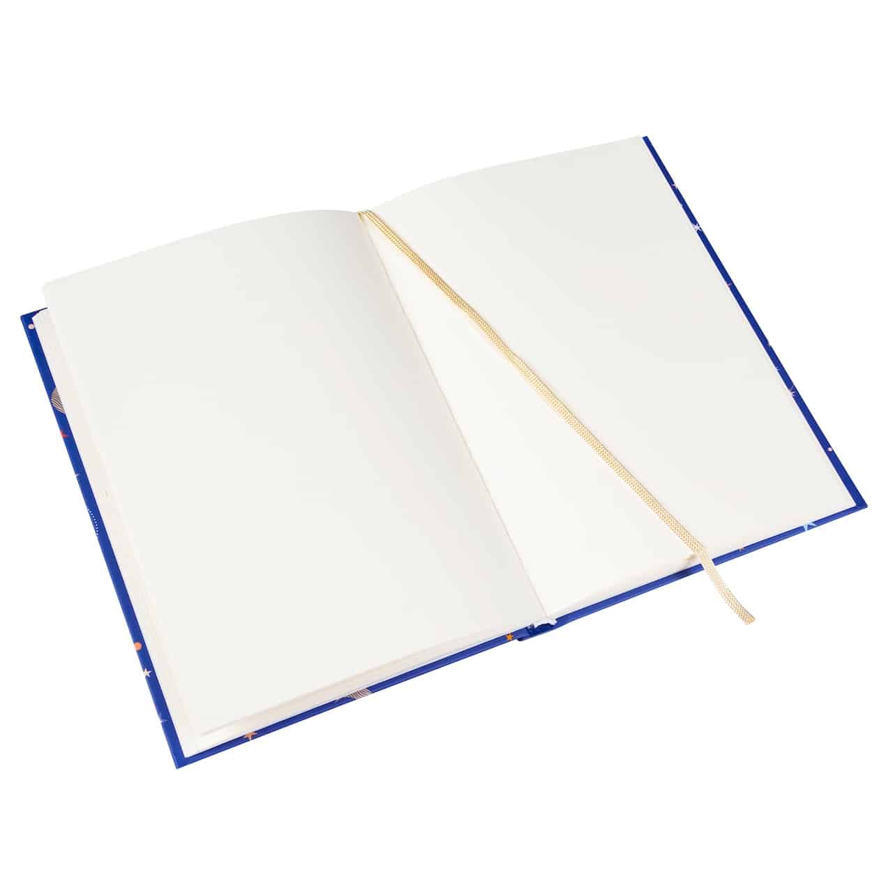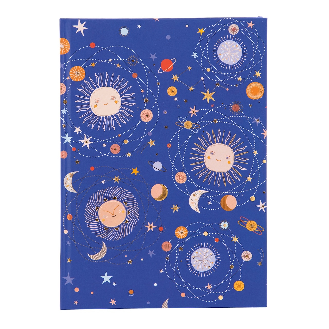 Het Notitieboek A5 Celestial van House of Turnowsky, met de hoogwaardige afwerking van Goldbuch, is een waar kunstwerk. De omslag toont een betoverende sterrenhemel met stralende zonnen, manen en planeten, omringd door verfijnde sterrenbeelden. De diepe blauwe achtergrond creëert een dromerige sfeer, terwijl warme tinten van oranje, goud en zachtroze een magische uitstraling geven.