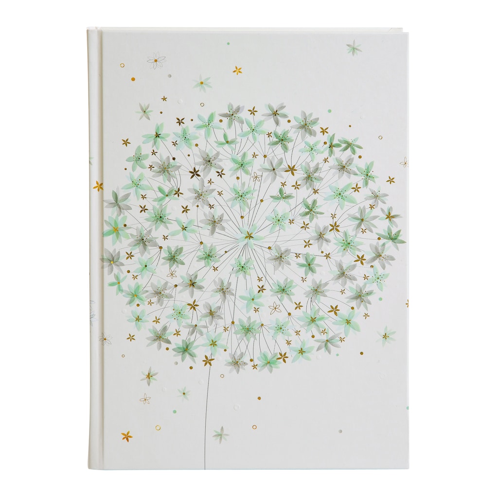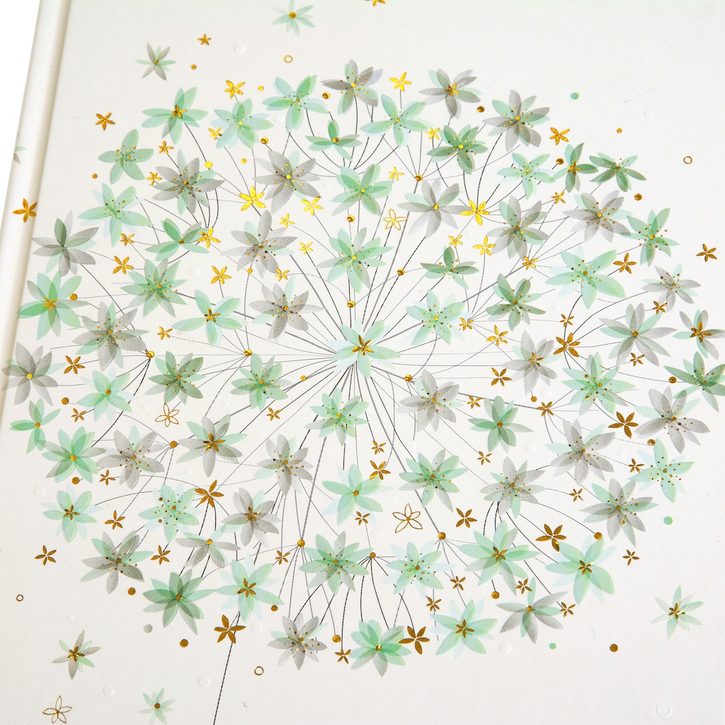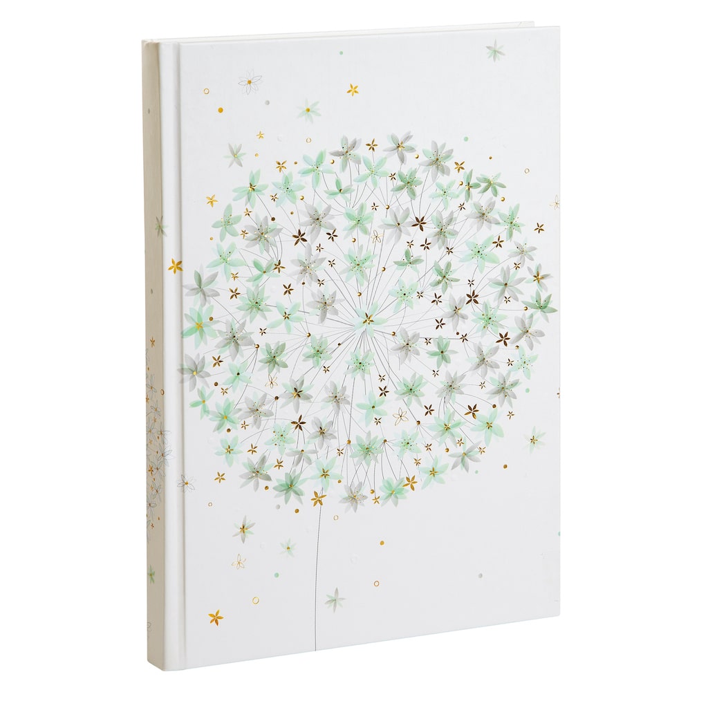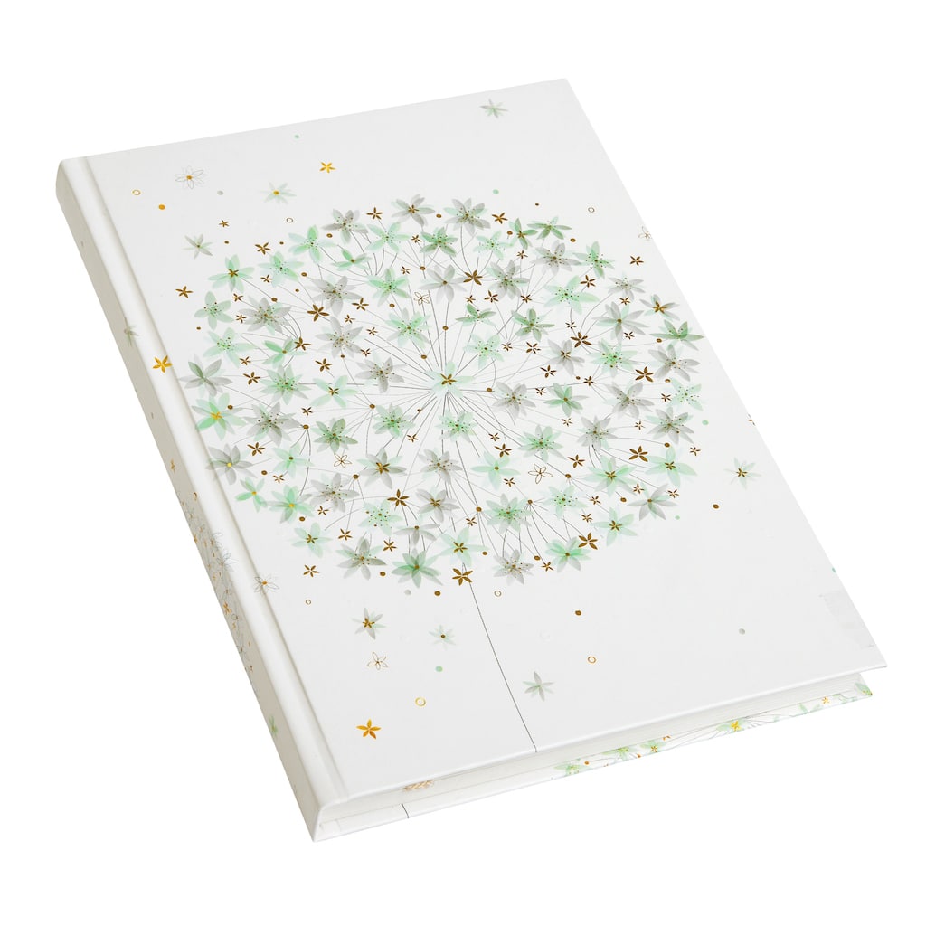 Het Notitieboek A5 Gentle Flower is een verfijnd en elegant ontwerp van House of Turnowsky, met vakmanschap vervaardigd door Goldbuch. De kaft toont een betoverende illustratie van een paardenbloem in zachte pasteltinten, met gedetailleerde accenten in mintgroen, grijs en goud. De subtiele off-white achtergrond zorgt voor een rustgevende en inspirerende uitstraling.