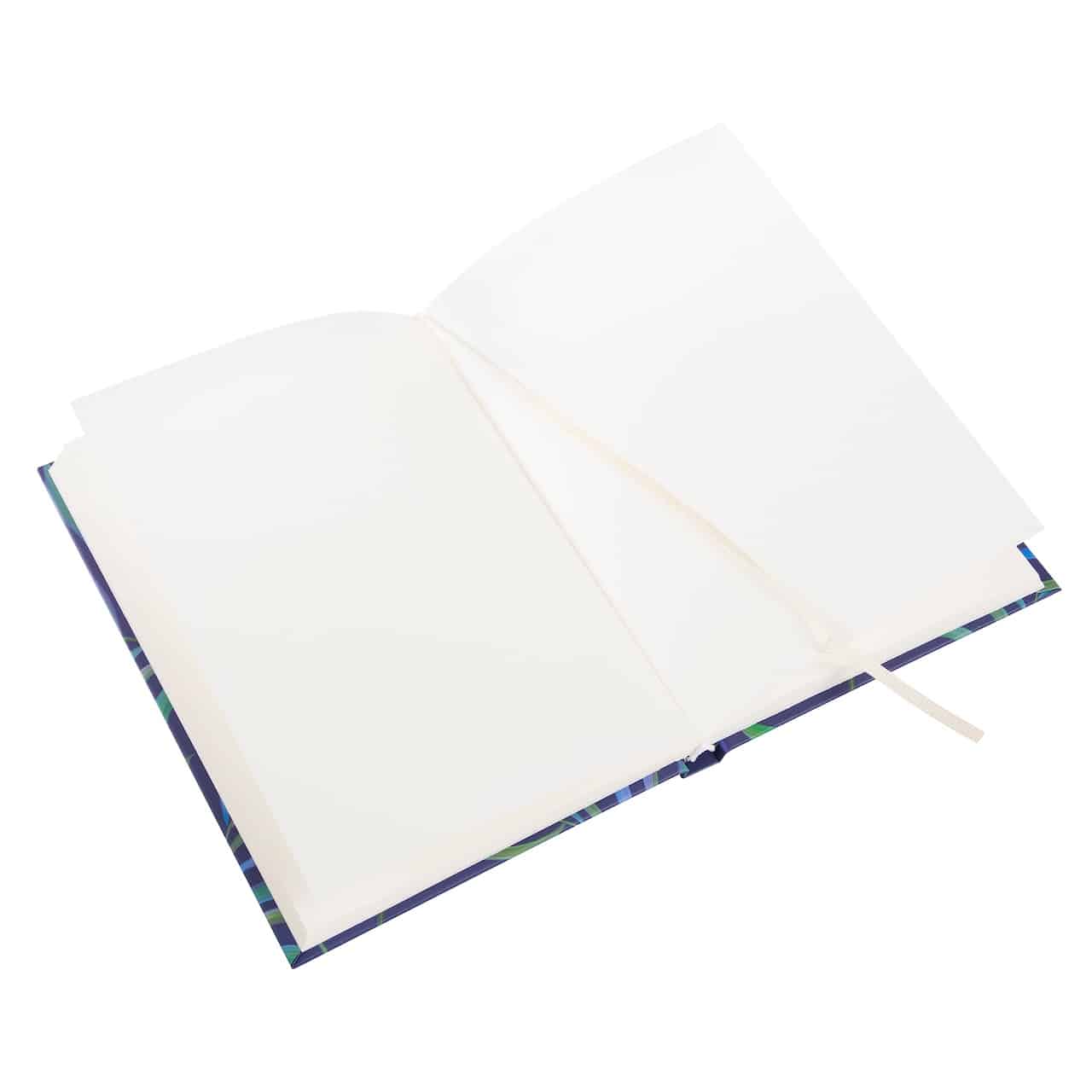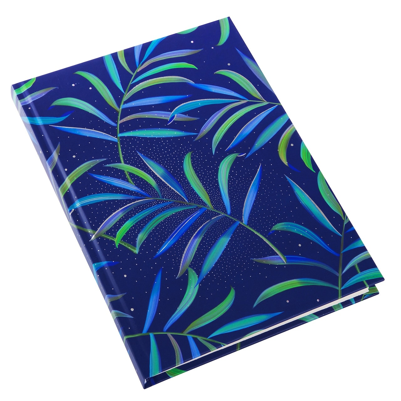Het Notitieboek A5 Tropical – Blue is een prachtig ontwerp van House of Turnowsky, vakkundig vervaardigd door Goldbuch. De kaft heeft een betoverend tropisch patroon met weelderige blauwe en groene palmbladeren op een diepe marineblauwe achtergrond. De verfijnde zilveren foliedruk voegt een subtiele glans toe, wat zorgt voor een elegante en mysterieuze uitstraling die doet denken aan een tropische nacht.