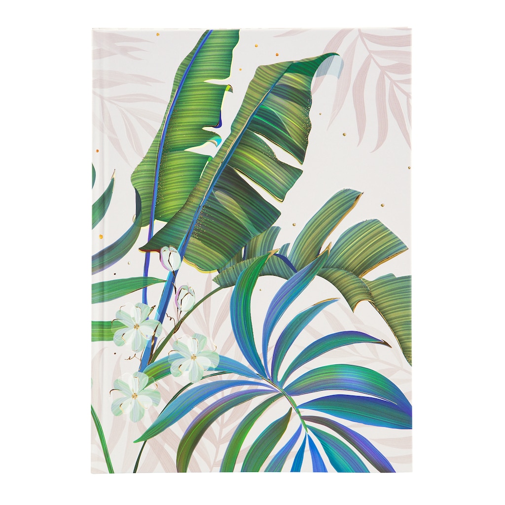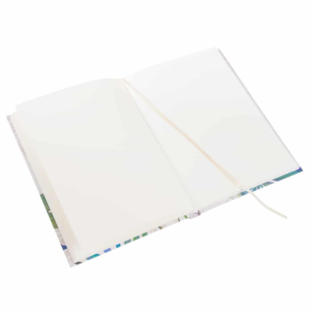 Het Notitieboek A5 Tropical – White is een prachtige creatie van House of Turnowsky, vakkundig vervaardigd door Goldbuch. De cover straalt een exotische elegantie uit met weelderige groene en blauwe palm- en bananenbladeren, gecombineerd met verfijnde witte bloemen. De zachte off-white achtergrond en subtiele gouden accenten geven dit notitieboek een frisse en luxe uitstraling.