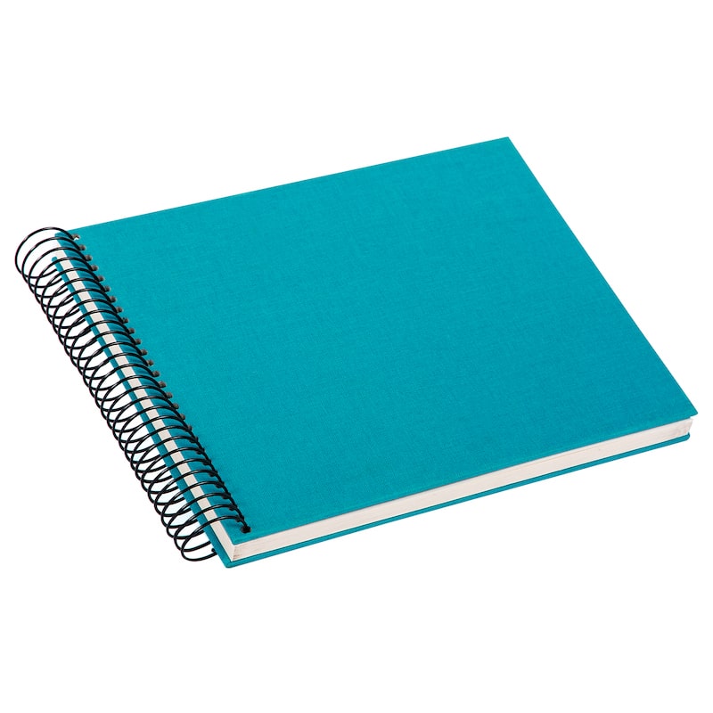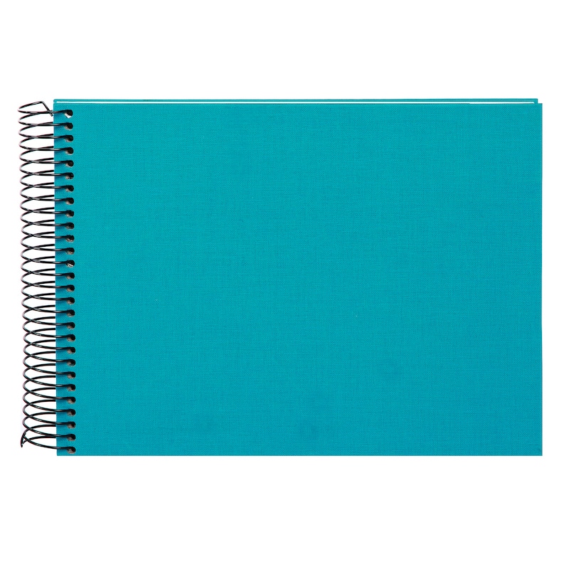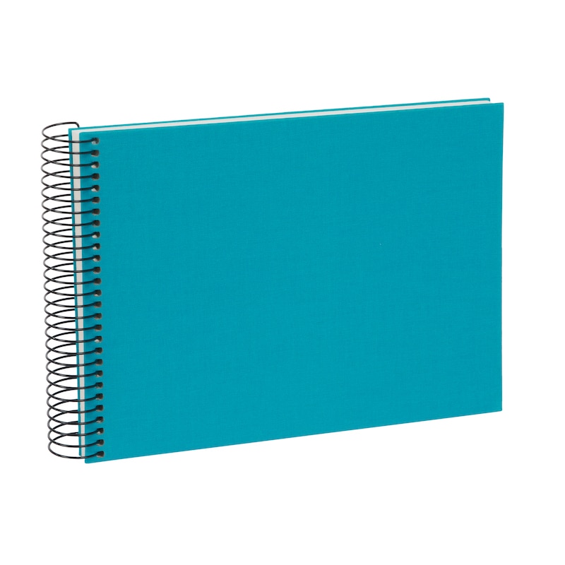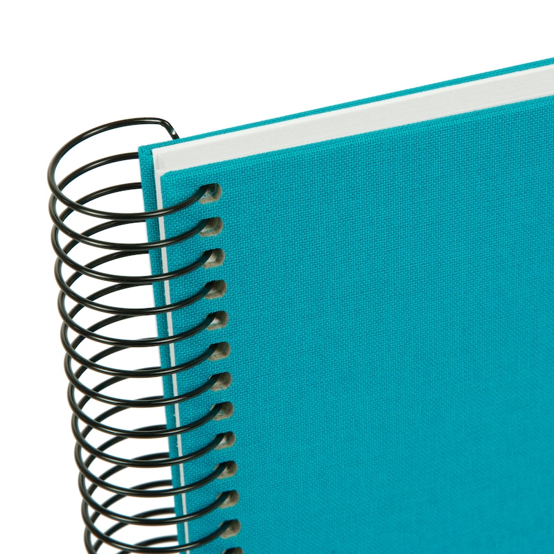 De zwarte spiraalbinding vormt een strak contrast met de turquoise linnen kaft en zorgt ervoor dat het album prettig open blijft liggen. Dat maakt foto’s inplakken en terugkijken extra comfortabel, ook als je het album graag aanvult met tekst, stickers of kleine herinneringen.