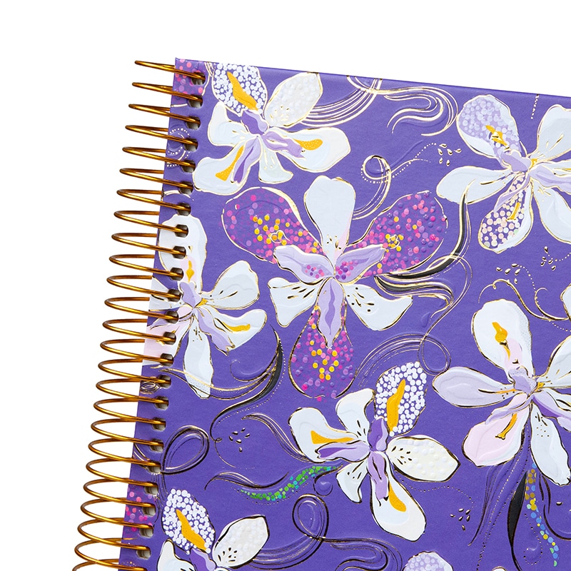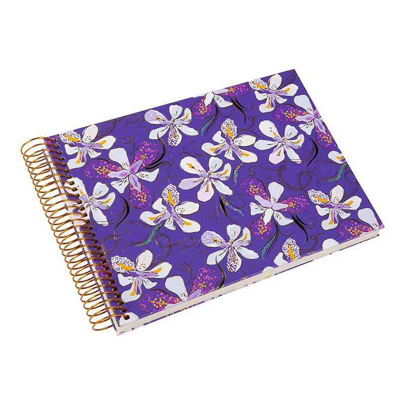 Breng kleur en elegantie in je herinneringen met het Orchid Mood spiraalalbum. De paarse kaft is versierd met sierlijke orchideeën in tinten van wit, lila en goud. Het levendige bloemenontwerp straalt luxe en stijl uit, perfect voor wie houdt van een vleugje kleur en elegantie.